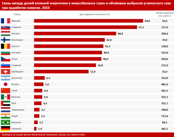 Мировой опыт показывает, что в странах с высоким уровнем развития атомной энергетики наблюдаются значительно меньшие объёмы углеродных выбросов. Например, Франция, где около 65% электроэнергии производится на атомных станциях, имеет одни из самых низких выбросов CO₂ в мире — всего 56 г/кВт·ч. Это свидетельствует о том, что увеличение доли атомной энергии в энергетическом балансе страны может значительно сократить углеродные выбросы.