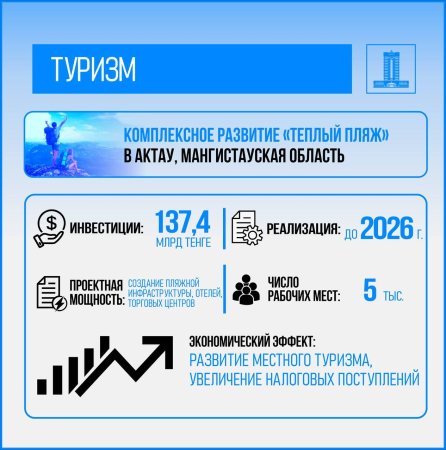 До конца 2024 года планируется завершение 119 инвестиционных проектов общей стоимостью 120,4 млрд тенге, что создаст 1 319 рабочих мест. Среди ключевых инициатив: строительство отеля «Medina Palace» в Туркестане; модернизация санатория «Аксу-Жабаглы» с добавлением новых гостиничных объектов.