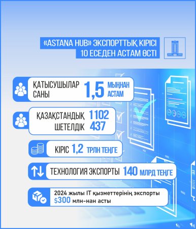 2024 жылы Қазақстанның IT саласы қарқынды өсімді көрсетті. IT-компаниялардың саны 18 683-ке жетті. Соңғы үш жылда 16% өсім. Мәселен, елімізде «Astana Hub» халықаралық технология паркі жұмыс істейді. Бүгінде ол Қазақстандағы IT-стартаптарды дамыту орталығы ретіндегі рөлін айқындады. Технопарк 1,5 мыңнан астам қатысушыны біріктірді. Олардың ішінде 1102 қазақстандық және 437 шетелдік компания бар. Қатысушылардың жалпы табысы 1,2 трлн теңгені құрады. Өсім соңғы бес жылда 31 есе артты. Биыл экспорттық түсім 140 млрд теңгеден асты. Төрт жылдағы жылдық өсім де 10 еседен астам. Осылайша, «Astana Hub» өңірдегі жетекші технопарк ретінде өз позициясын нығайтуды жалғастыруда.