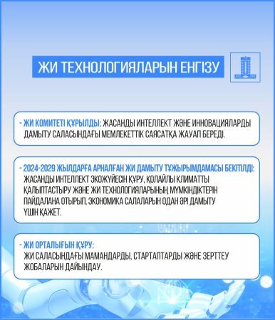 - 2024-2029 жылдарға арналған ЖИ дамыту тұжырымдамасы бекітілді;
