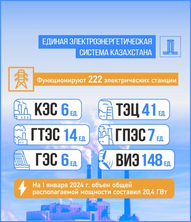 В Казахстане функционируют 222 электрических станции (КЭС — 6 ед., ТЭЦ — 41 ед., ГТЭС — 14 ед., ГПЭС — 7 ед., ГЭС — 6 ед., ВИЭ — 148 ед.). Из них 148 объектов ВИЭ (малые ГЭС — 51 ед., ВЭС — 54 ед., СЭС — 42 ед., БГУ — 1 ед.) общей мощностью 2,9 ГВт.