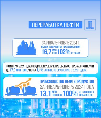 За январь-ноябрь 2024 года объем переработки нефти в Казахстане составил 16,7 млн тонн, что составляет 102% от плана (план — 16,4 млн тонн). Ожидается, что по итогам 2024 года объем переработки нефти увеличится до 17,9 млн тонн, что на 1,1% больше по сравнению с 2023 годом. Производство нефтепродуктов (бензин, дизельное топливо, мазут, авиакеросин, битум) за январь-ноябрь