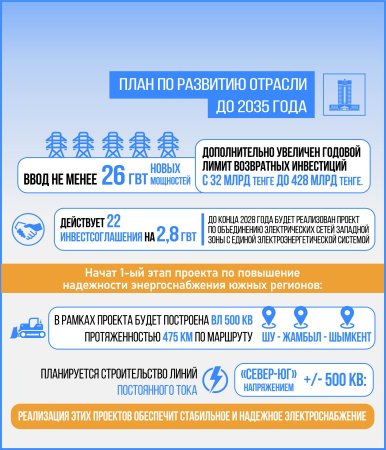 Дополнительно был увеличен годовой лимит возвратных инвестиций с 32 млрд тенге до 428 млрд тенге. Это позволило расширить пул проектов по модернизации, расширению и реконструкции основного оборудования для действующих энергопроизводящих организаций.