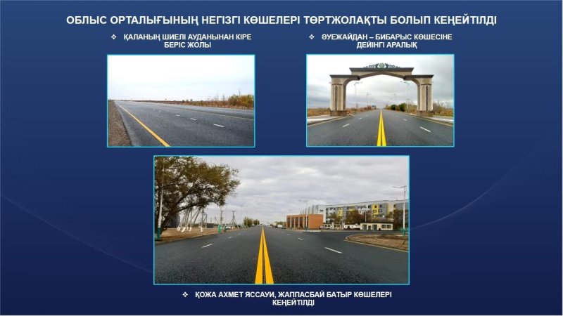 Облыс орталығының негізгі көшелері әуежайдан Бейбарыс сұлтан көшесіне дейінгі аралық, қалаға Шиеліден кіреберіс жол, Яссауи, Жаппасбай батыр магистралды көшелері, Тәуелсіздіктің 25 жылдығы даңғылы төртжолақты болып кеңейтілді.