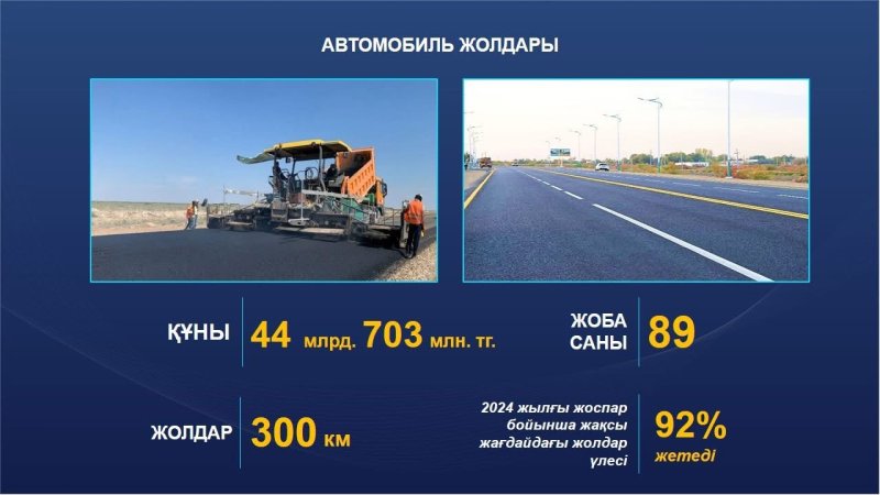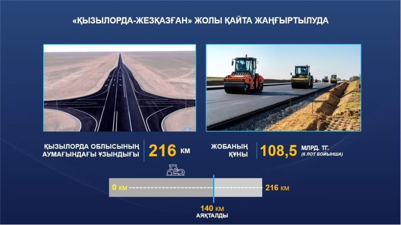 Айта кетейік, жылдар бойы күн тәртібінен түспеген «Қызылорда-Жезқазған» автожолы Президенттің тікелей тапсырмасымен қайта жаңғыртылуда. Жоба құны – 108 млрд. 500 млн теңге. Қызылорда облысының аумағына тиесілі 216 шақырым жолдың 140 шақырымы аяқталды. Қалған бөлігі 2026 жылы ел игілігіне беріледі.