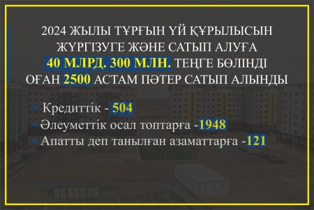 Ал, бұл екпіннің елге тұрмыстық түлеу ғана емес, үлкен сәулет салтанатын әкелгенін де айтуға тиіспіз. Бұл жағдай 17 мың адамның баспана мәселесін шешуге ықпалын тигізді. Демек, тұрғын үй құрылысын қарқынды жүргізуде көшбасшы өңірде алдағы уақытта да еңбек еселене түспек.